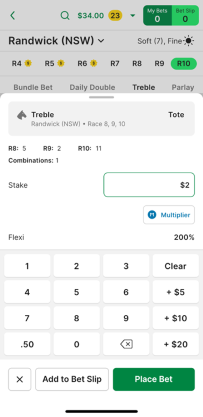 5. If there is a ‘Treble’ bet option available, it will be shown in the ‘Multi Legs’ section. If available, tap the ‘Daily Double option. Tapping the ‘Treble’ option will take you to the first leg of the ‘Treble’ so you can start building your bet.