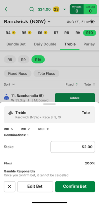Once you’ve made your selections for all three legs/races of your ‘Treble’ bet, tap ‘Bet Now’.