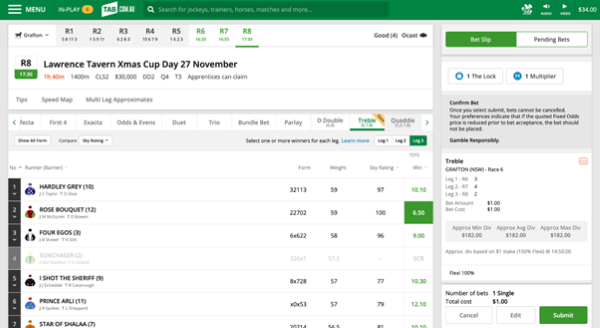 A ‘Treble’ bet involves selecting the winner of three races nominated by TAB using any amount of selections. A ‘Treble’ is like a ‘Quaddie’ but with one less leg/race.