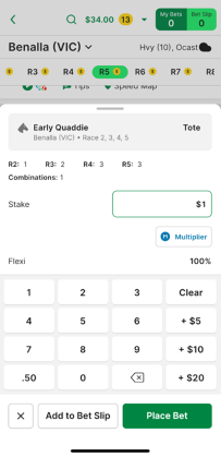 4. On the race meeting page, tap the ‘Multi legs’ icon located above the races (or scroll down past the races) to see if there is an ‘Early Quaddie’ option available for the race meeting.