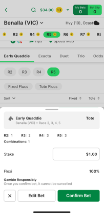 8. Once you’ve made your selections for your ‘Early Quaddie’ bet, tap ‘Bet Now’.