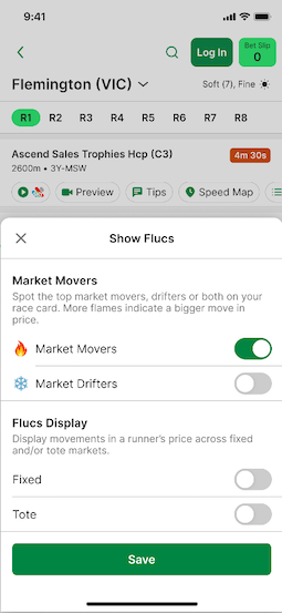 To turn the ‘Market Movers & Drifters’ feature on/off, tap ‘Show Flucs’ on the Win/Place race card. Then, toggle ‘Market Movers’ and ‘Market Drifters’ on/off and decide which odds you want to display price movements for (i.e., fixed odds and/or tote markets odds).