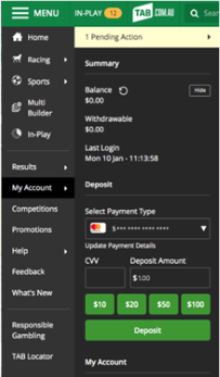 Find out how to add your debit card to your TAB account here. Once you’ve added your debit card to your account, making debit card deposits is quick and easy. Please note: When you deposit funds into your TAB account, you’ll only be able to withdraw those funds once they have been turned over (i.e., used to bet). So, only deposit funds into your account that you intend to bet with.
