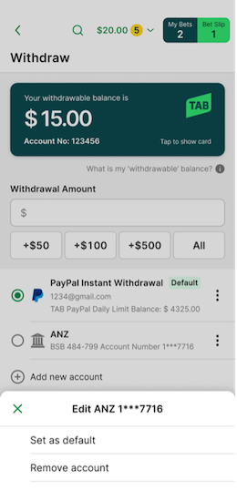 To edit or remove a bank account linked to your TAB account, tap the three dots next to the account.