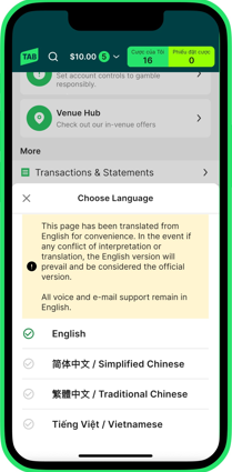 The Multilingual Toggle lets you change parts of the TAB app into Simplified Chinese, Traditional Chinese, or Vietnamese, making it easier to use if English isn’t your first